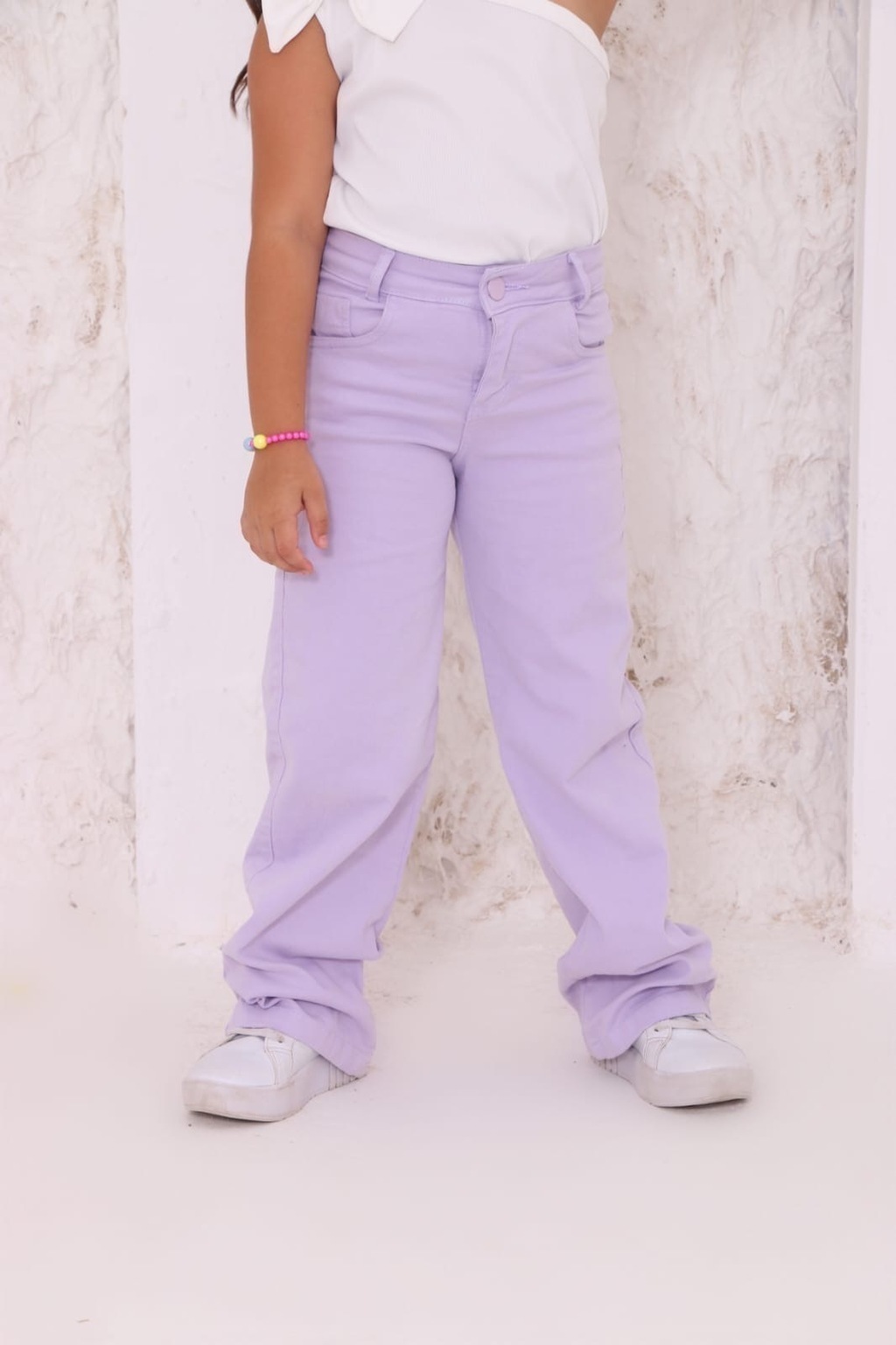 Calça 100% jeans estilo wide leg lilás. Com regulador na cintura. Qualidade premium.